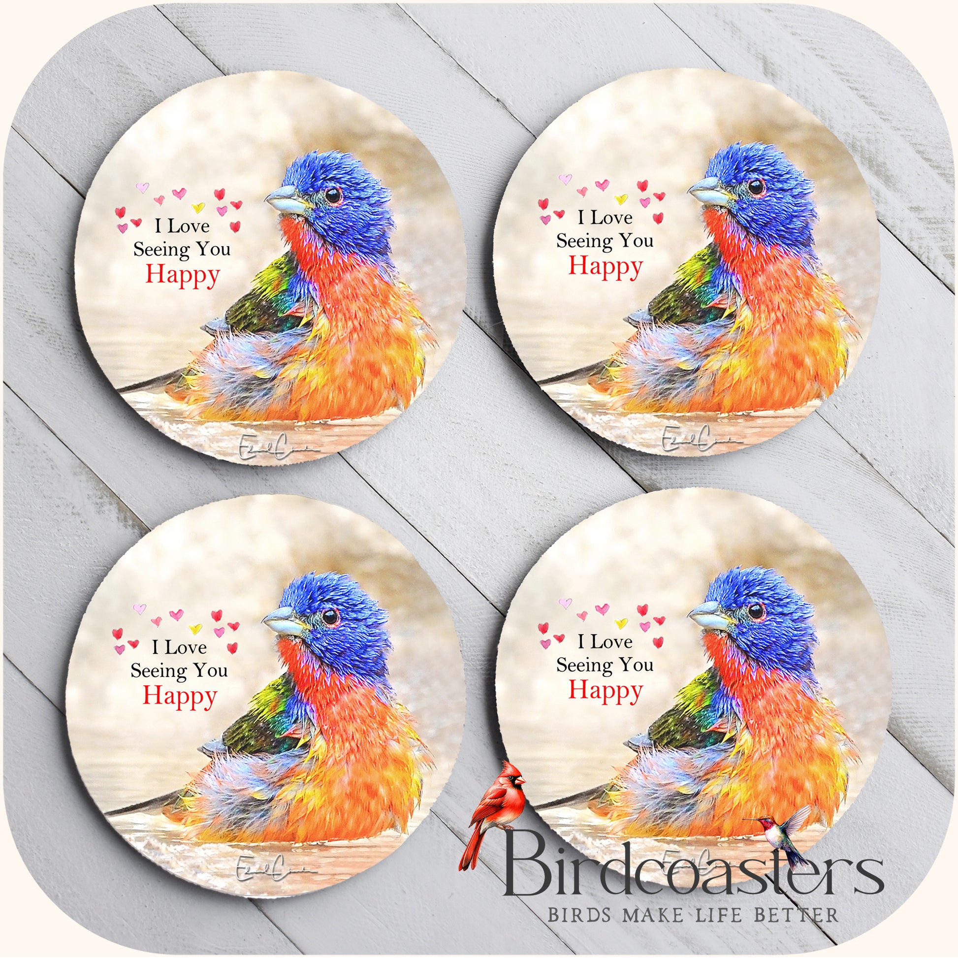 This piece pairs a vivid Painted Bunting with a simple, heartfelt message - I Love Seeing You Happy.