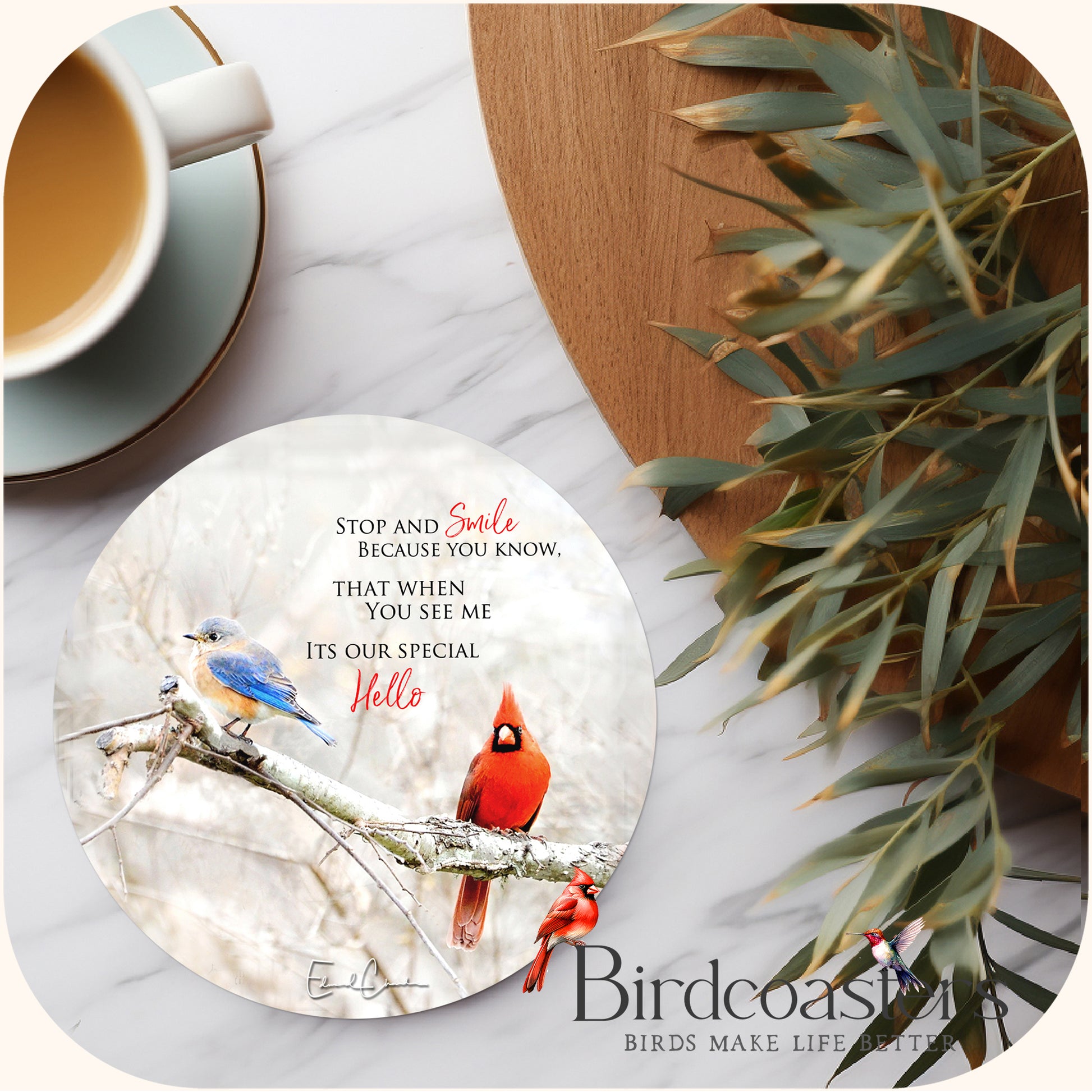 This piece pairs a bluebird and a cardinal with the tender reminder - Stop and smile, because you know, that when you see me, it's our special hello.