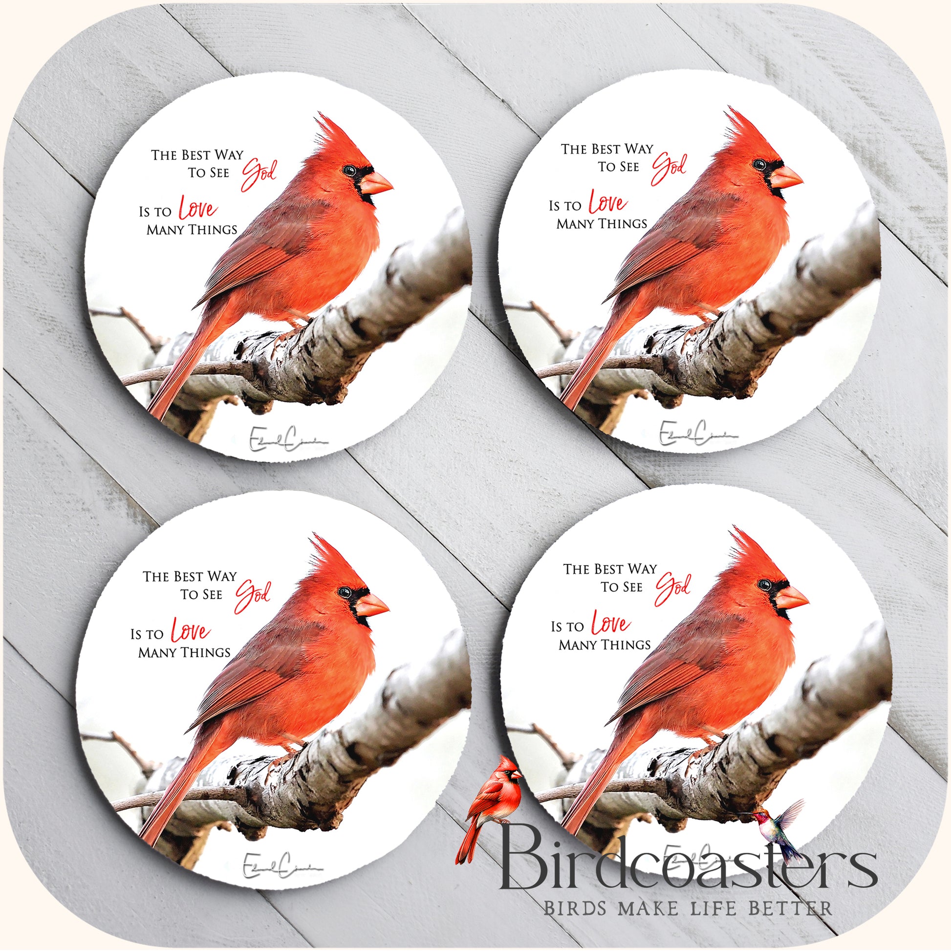 This piece features a solitary cardinal paired with a simple truth - The best way to see God, is to love many things.