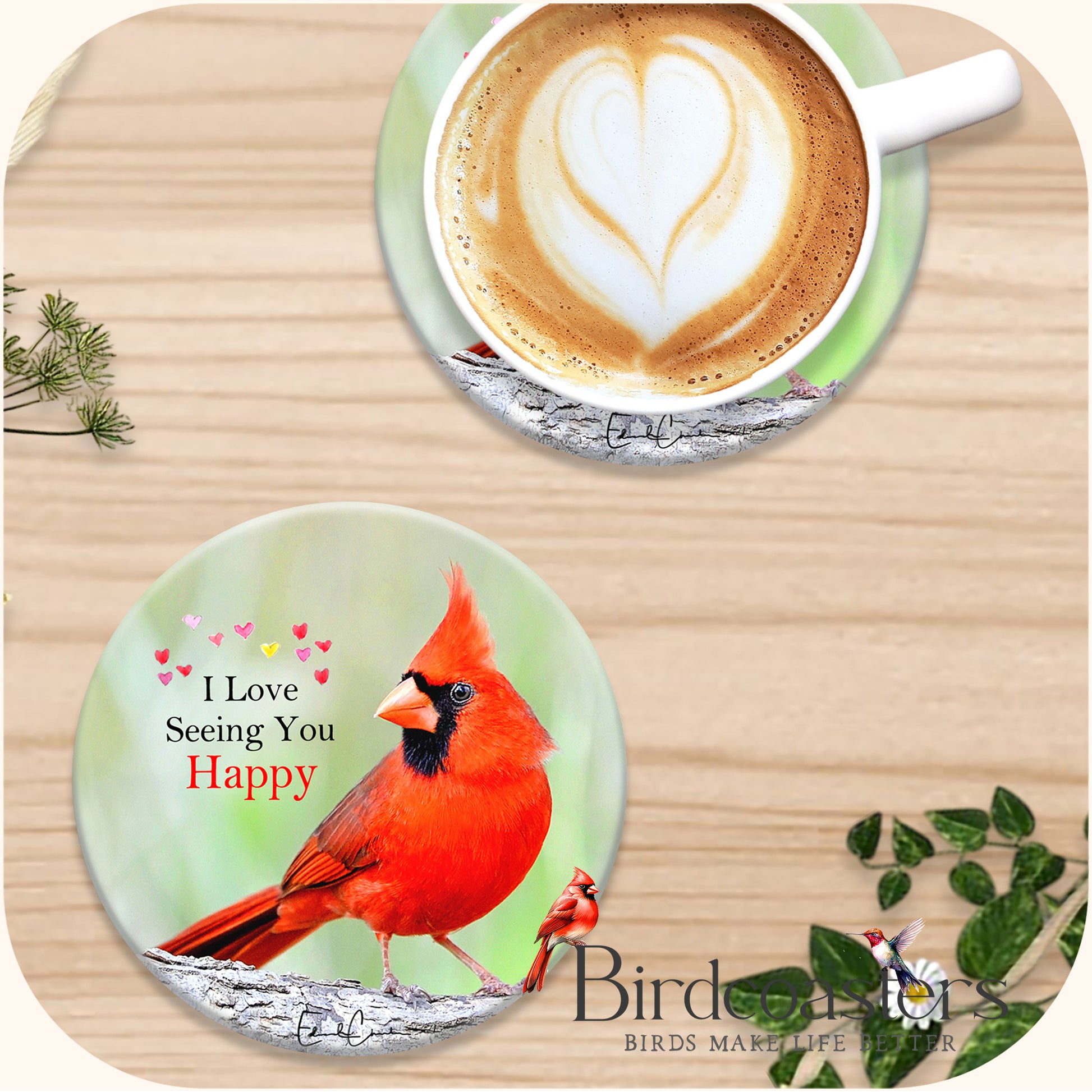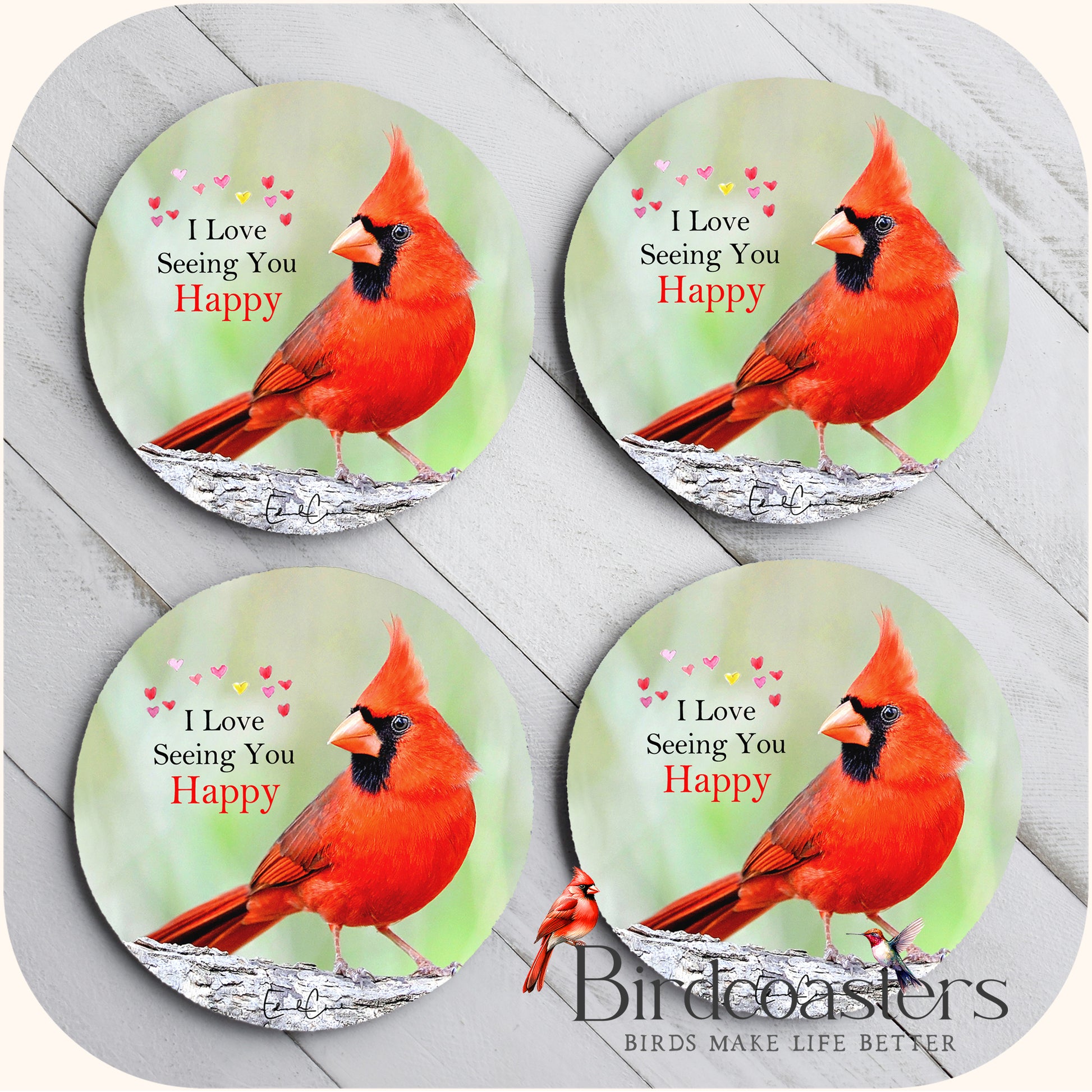 This piece shows a bright Cardinal with a simple, heartfelt message - I Love Seeing You Happy.
